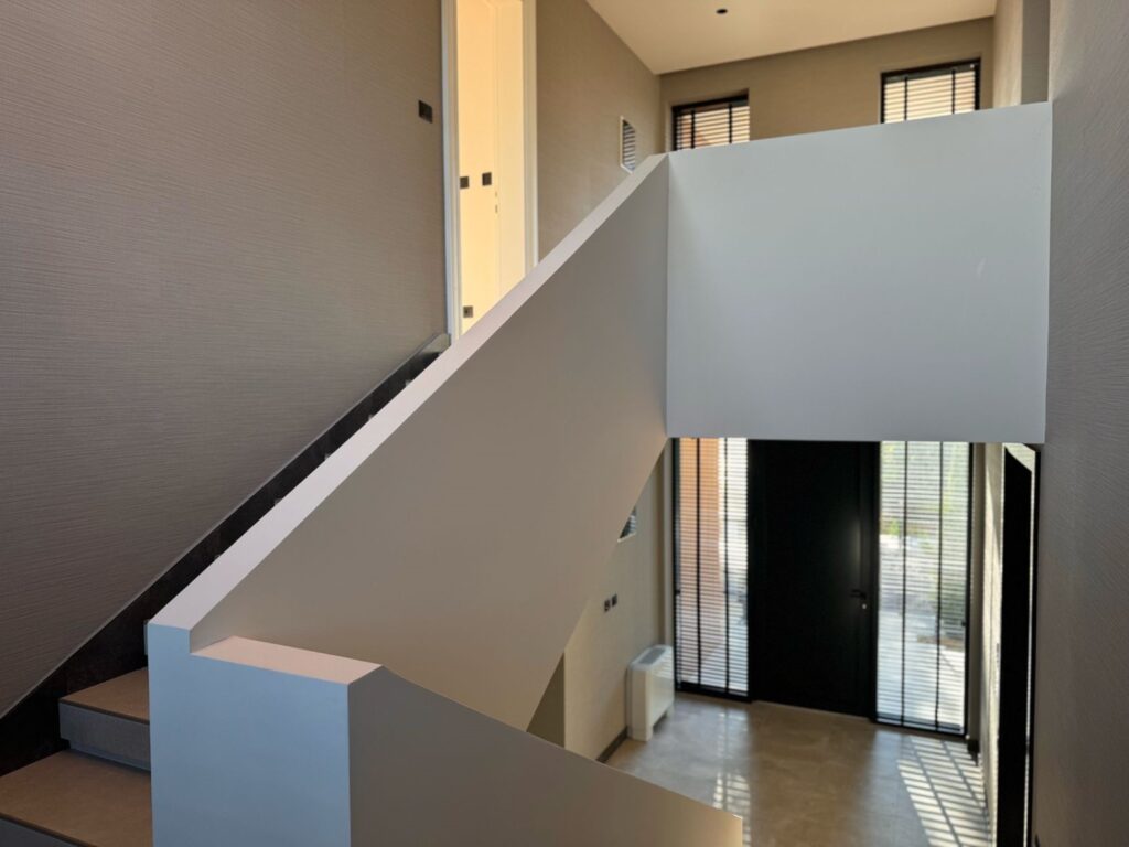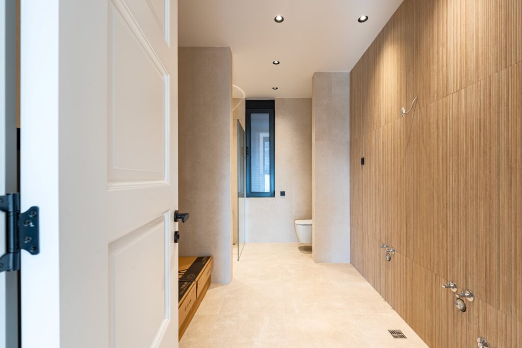 The interior is designed with carefully selected materials and renowned brands: Tarkett flooring, ceramics and sanitary ware by Porcelanosa, while aluminum joinery by Alumil with triple-glazed Solar glass contributes to energy efficiency and sound insulation. The façade combines Bekament and Alubond systems, with thermal and hydro insulation by Knauf and Termosilent, ensuring durability and a high level of comfort.