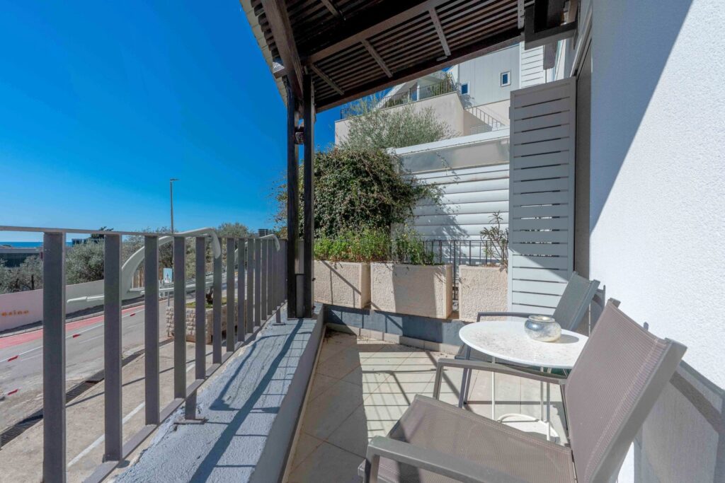 Furnished and fully equipped 1-bedroom apartment with sea view, located in a luxury residential complex in close proximity to the Hotel Maestral, tennis courts and the sandy beach in Pržno. A closed garage space is also available for purchase with the apartment.